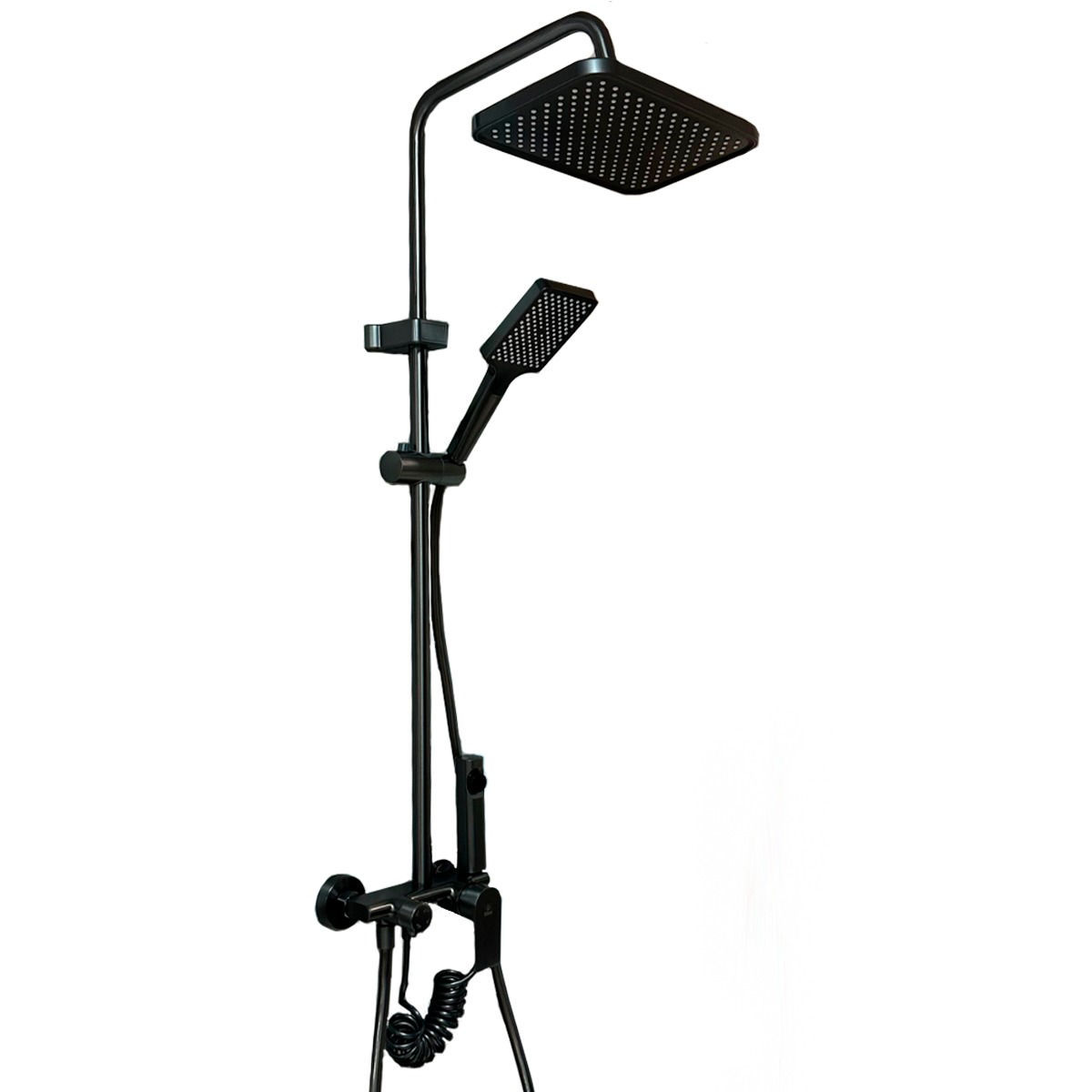 Roseta fabricada en plástico ABS, con cabezal móvil.Medida de roseta 27 x 17 cmLargo del brazo 40 cm.Largo total (largo del brazo + roseta) 46 cm Altura total del barral 1 metro Medida desde eje (salida de agua) a fijación superior: 69 cmDistancia entre ejes (salida de agua): 15 cm Teléfono de mano , fabricada en plástico ABS.Medida de lluvia del teléfono 9,5 x 12 cm Ancho del cuerpo de la grifería 19 cmAvance del cuerpo de la grifería 13 cm Largo del flexible (tipo manguera): 1,45