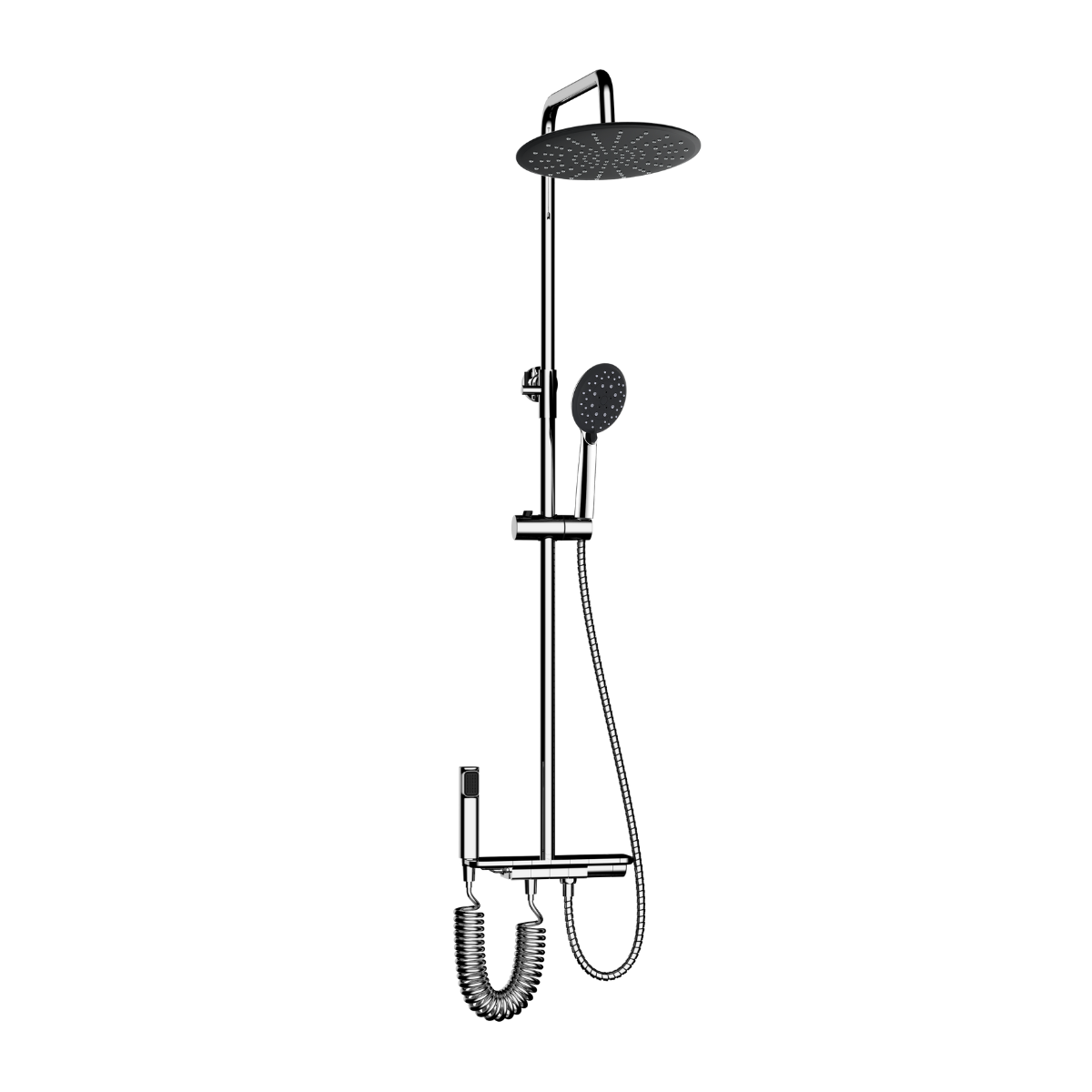 Medidas- Roseta superior Ø 20 cm: rociado envolvente con ángulo de 60° para una ducha más relajante.- Altura total del conjunto: 75 cm, con regulación adicional entre 15 y 40 cm.- Avance de la roseta: 41 cm desde la pared.- Separación de las tomas de agua: 15 cm.- Base de conexión: 5,5 cm.