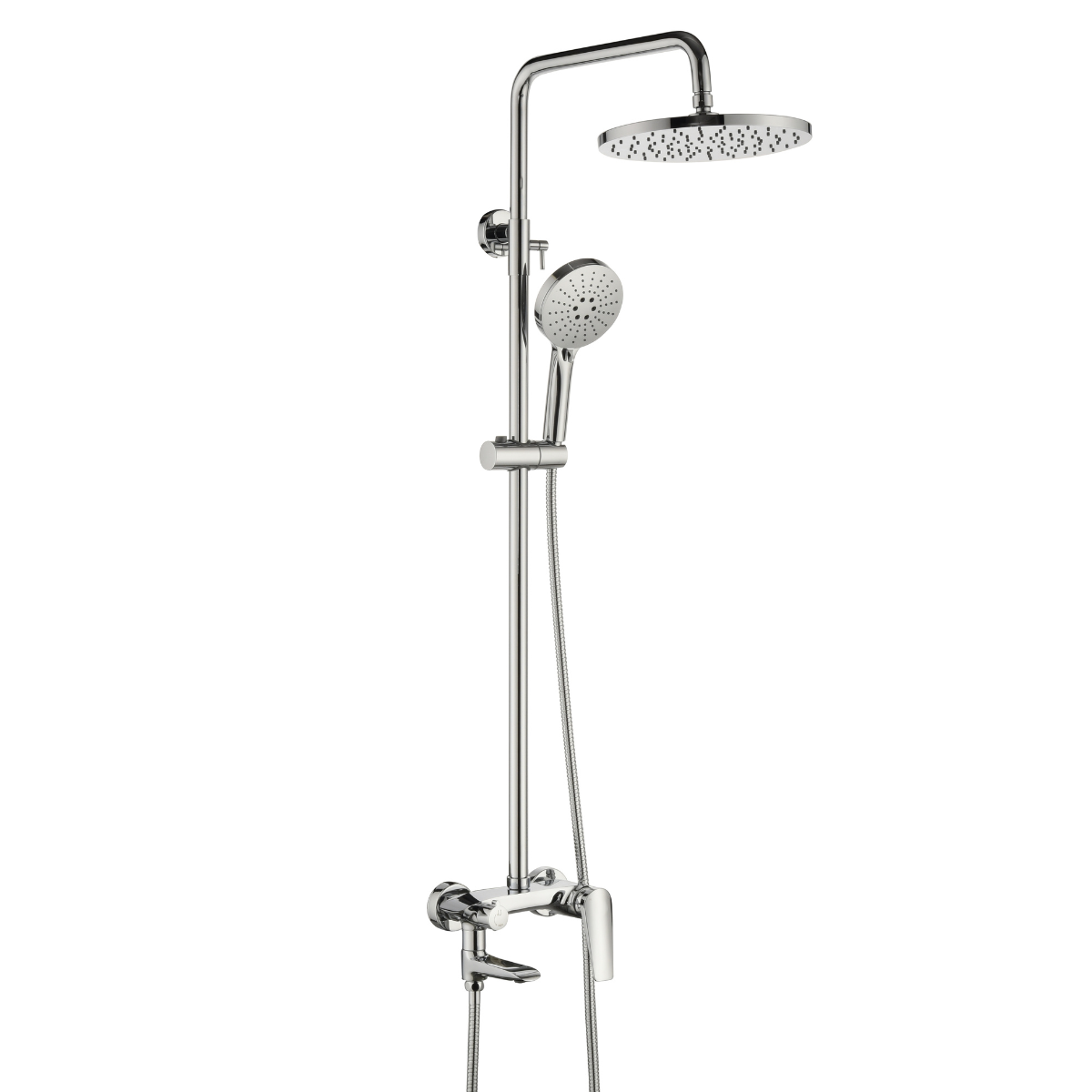 Roseta de 25 cm de diámetro.Largo del brazo 41 cm. Largo total (largo del brazo + roseta) 54 cm Altura regulable: 97 cm a 1,40 cm Medida desde eje (salida de agua) a fijación superior: 85 cmDistancia entre ejes (salida de agua): 15 cm Teléfono de mano con sistema anticalcareo, con 3 funciones, fabricada en plástico ABS. Diámetro del teléfono 12 cm. Transferencia Móvil con un avance de 18 cm Ancho del cuerpo de la grifería 21 cm