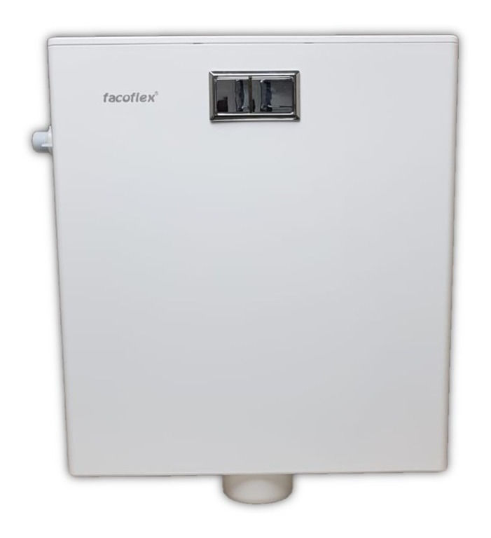Cisterna de colgar con doble descarga Facoflex BOTÓN FRONTAL. Cuenta con un mecanismo que permite realizar una descarga de 3 o 6 litros dependiendo de la necesidad, permitiendo generar un ahorro de 40% a 70% de agua. Incluye bajada de cisterna y todos los accesorios correspondiente. Fabricado con materiales termoplástico de alta resistencia brindando mayor durabilidad. Entrada de agua izquierda o derecha, usted elige de que lado desea conectarla.Medidas: 37cm x 40cm x 10cm.