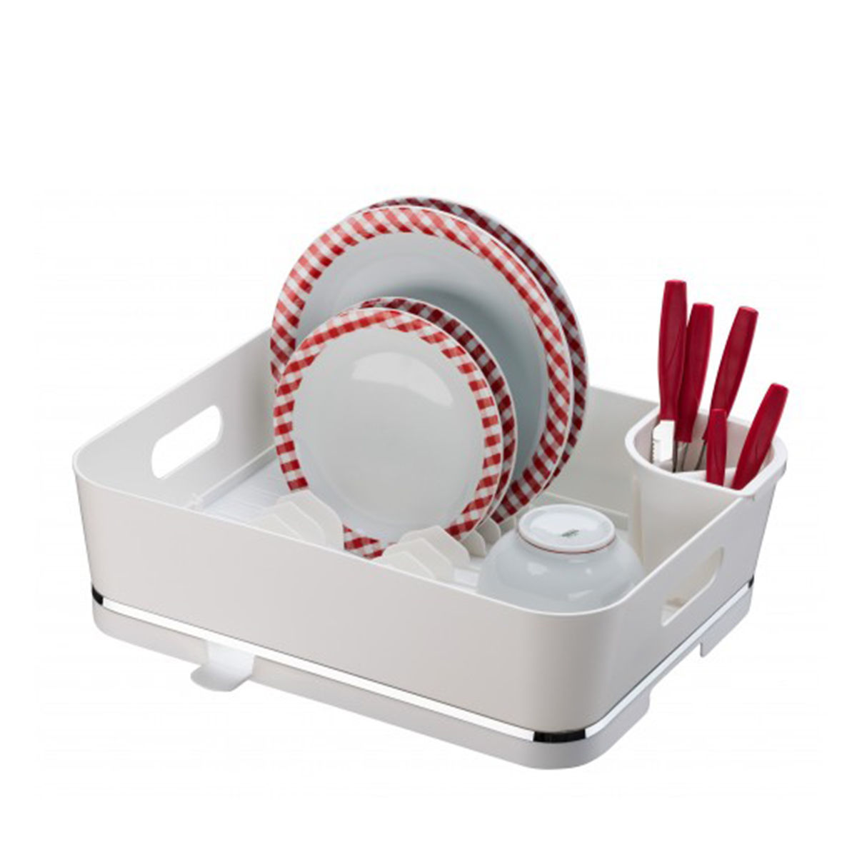 El escurridor de platos tiene un pico fijo para el flujo de agua. Dirige esta salida de agua hacia el recipiente y el fregadero siempre permanece seco. Tiene capacidad para 11 platos y portacubiertos extraíble. Está fabricado en plástico con detalles en acero cromado (acero de forma plana).Atención: la boquilla es fija e inmóvil, por lo que no es posible cambiarla de lugar ni cerrarla.