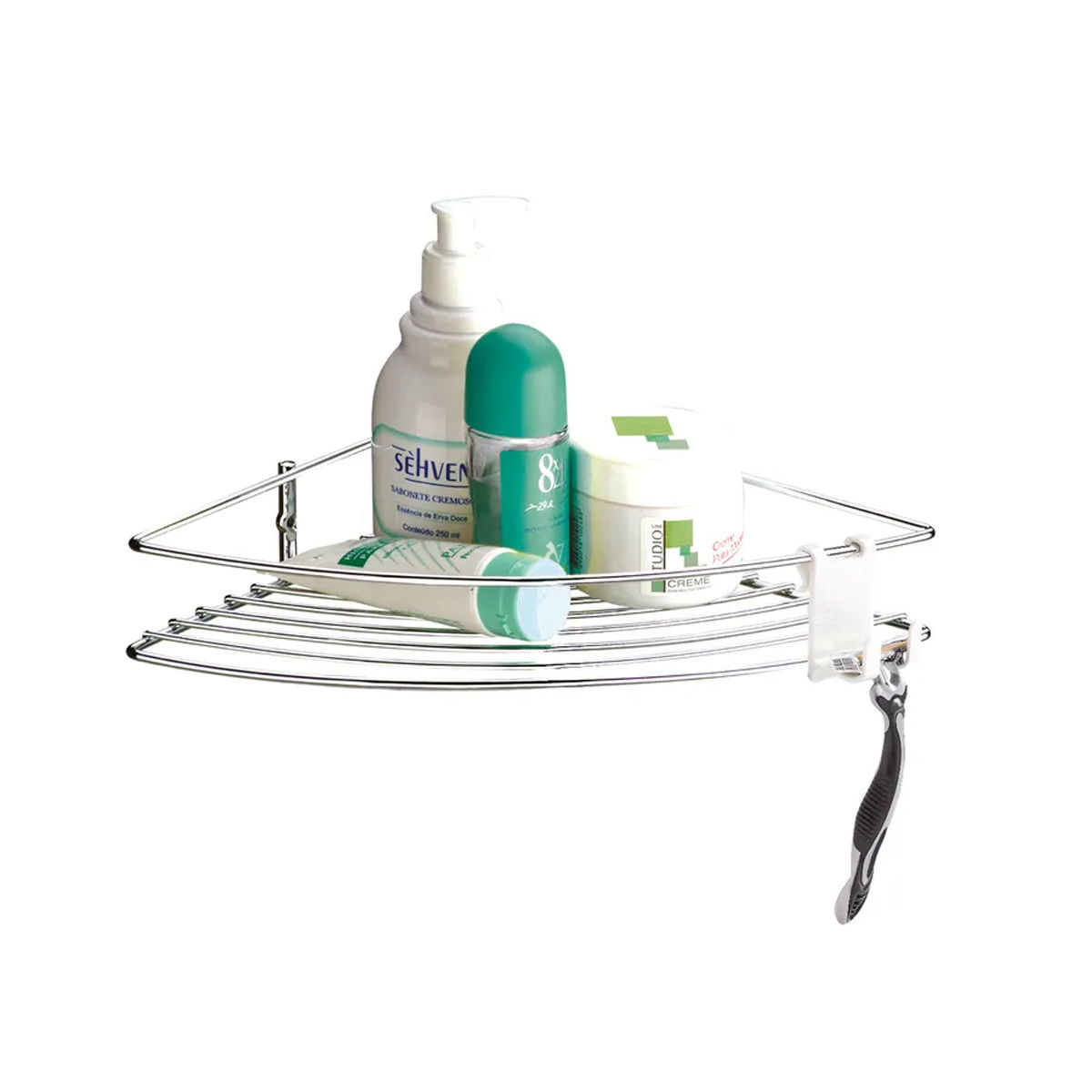 Es el modelo ideal para baños con cabina de ducha pequeña. Aprovecha al máximo el espacio, con organización y funcionalidad. Dispone de un gancho de plástico movible para colocar la hoja de afeitar o colgar la esponja de baño.Además del tratamiento superficial tradicional de Future, donde se aplican hasta 4 capas de metal, los productos están recubiertos con una capa adicional de protector especial Rust Free, garantizando colores brillantes y vibrantes, así como una mayor resistencia contra la oxidación.Medidas: Fondo: 24cm / Ancho: 24cm / Alto: 5cm / Peso: 0.284kgMateria prima: Acero al carbonoColor/Acabado: CromoLínea: SuperiorConsejos de uso:- Para la limpieza periódica se recomienda utilizar un paño suave, agua y jabón neutro.- Nunca utilice materiales abrasivos, lana de acero, esponjas ásperas, disolventes o productos químicos corrosivos (cloro, lejía).Artículos incluidos: 1 Soporte en Ángulo + 1 Gancho Móvil + 1 Kit de Fijación