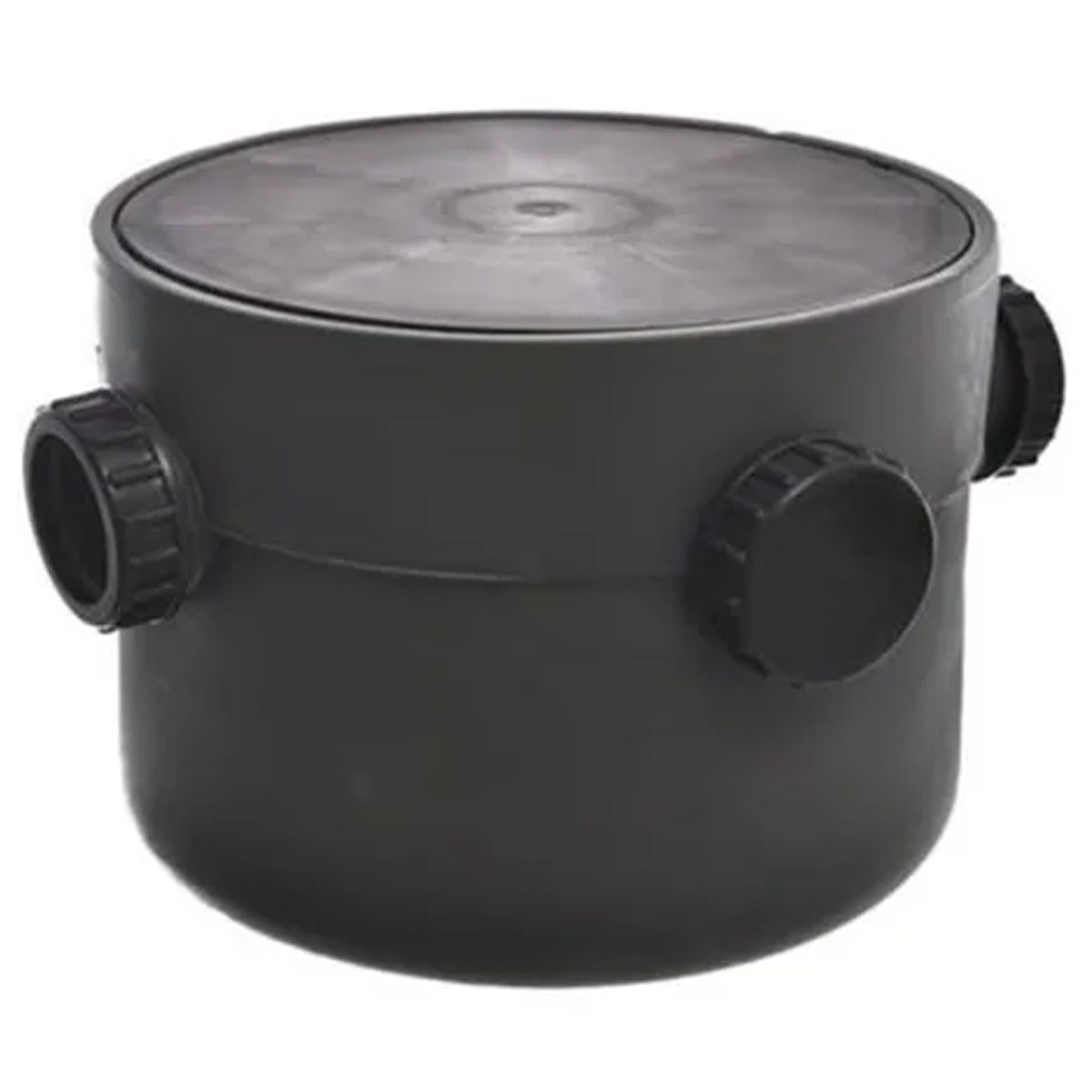Interceptor de grasas Inplast. Fabricado en polietileno de alta densidad, 3 entradas opcionales con sistema de tuerca y o'ring para caño de 50mm. Una salida de 50mm. Mide 20 cm de altura, 27 cm de diámetro y tiene 15 litros de capacidad.
