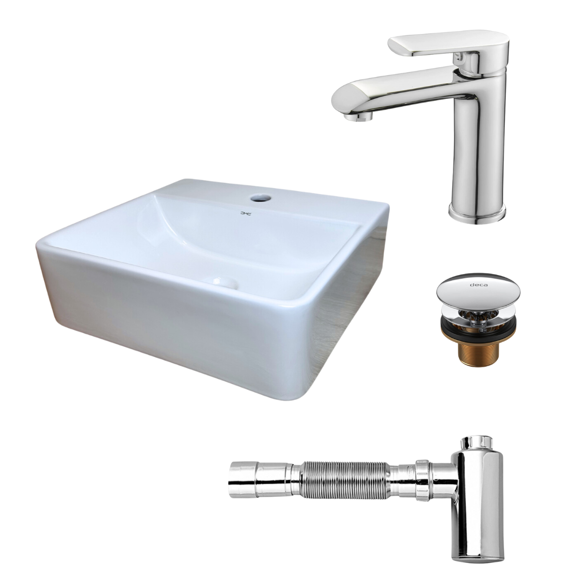 - Sifón cromado botella chico plástico univer. Blukit - Válvula de lavatorio bronce Deca cromada - Bacha de apoyo rectangular DMC 42x39x13 - Monocomando lavatorio Euro bronce cromado