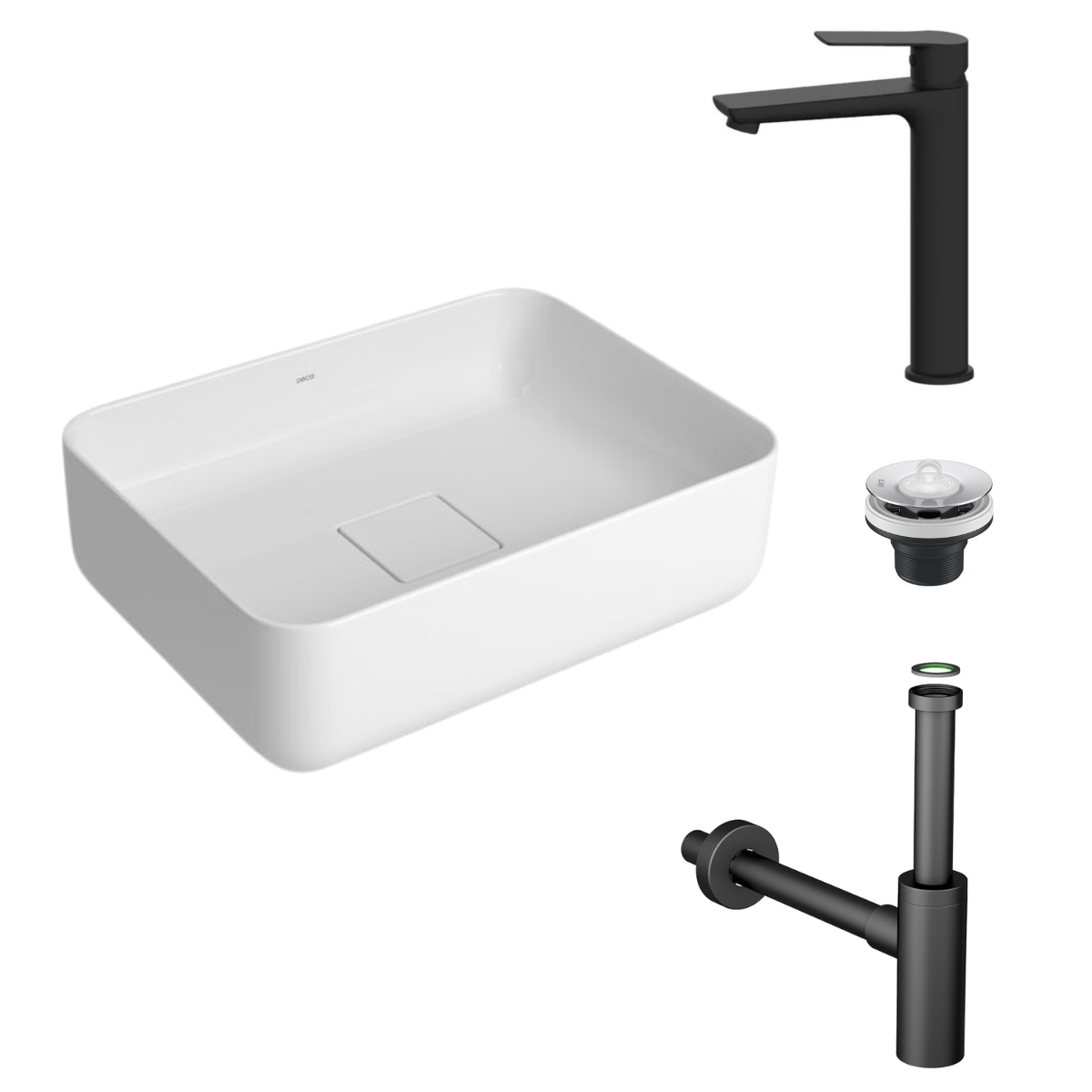 El juego de lavatorio completo incluye una bacha de baño de apoyo rectangular marca Deca, bacha de excelente calidad fabricada en cerámica. Grfería de lavatorio Blaster fabricada en bronce con 5 años de garantía. Incluye válvula de lavatorio deca y sifón ideal para quedar a la vista. Monocomando lavatorio Alto Blaster Negro Mate Bronce Válvula de lavatorio bronce tapa plástica Deca Bacha rectangular 40x30 cm blanca Deca Sifón botella lavatorio Inoxmater 1.1/4 NEGRO BONOMINI