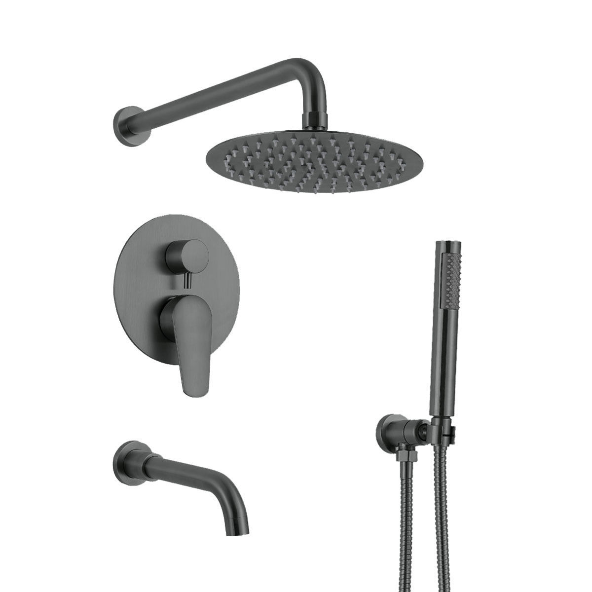 Dale un toque de modernidad y elegancia a tu baño con la Grifería de Ducha Monocomando de Embutir Celtic Grafito. Fabricada en acero inoxidable 304 con acabado mate, ofrece máxima durabilidad, resistencia a la corrosión y un diseño sofisticado que transforma cualquier espacio.Características- Monocomando de embutir con transferencia y teléfono de ducha.- Material: Acero inoxidable 304, ideal para ambientes húmedos.- Cartucho cerámico de 35 mm para un uso suave y preciso.- Acabado mate grafito, moderno y fácil de mantener.- Soporte para teléfono con regulador de ángulo.- Pico de transferencia con aireador.- Garantía de 5 años, porque tu tranquilidad es nuestra prioridad.Medidas- Roseta: 20 cm de diámetro- Brazo de ducha: 40 cm de largo- Diámetro de la base del monocomando: 18 cm- Profundidad del monocomando: 8,5 cm- Largo del pico de transferencia con aireador: 22 cm- Diámetro del teléfono de ducha: 10 cmPerfecta para quienes buscan calidad, estilo y funcionalidad en cada detalle.