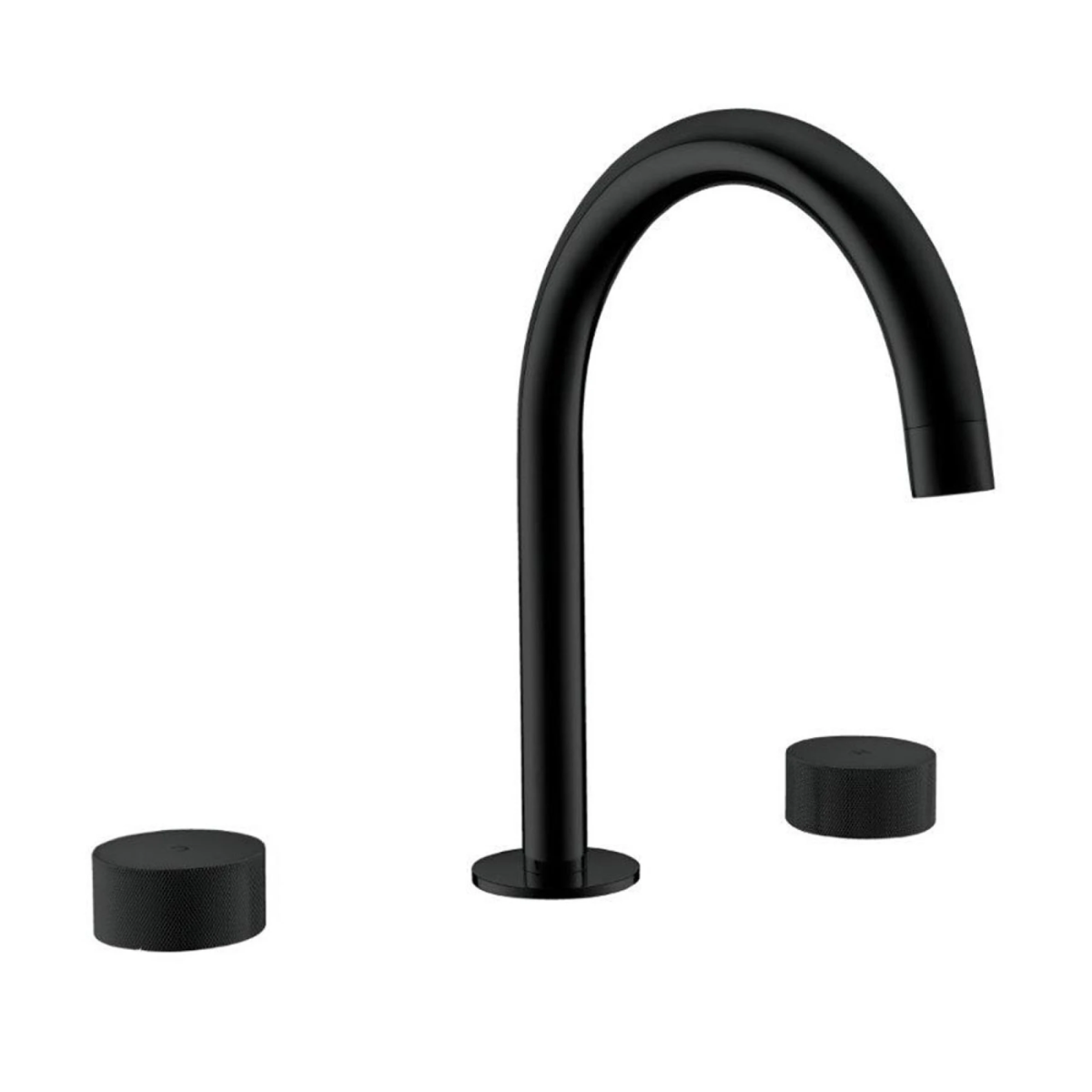 Disfruta de la funcionalidad y el estilo con esta grifería de lavatorio bimando en negro mate de la serie Nuoro de Aqualia. Con volantes labrados, esta grifería ofrece un diseño elegante y funcionalidad superior para tu baño. Renueva tu espacio de baño con la calidad y el estilo de Aqualia Nuoro en negro mate