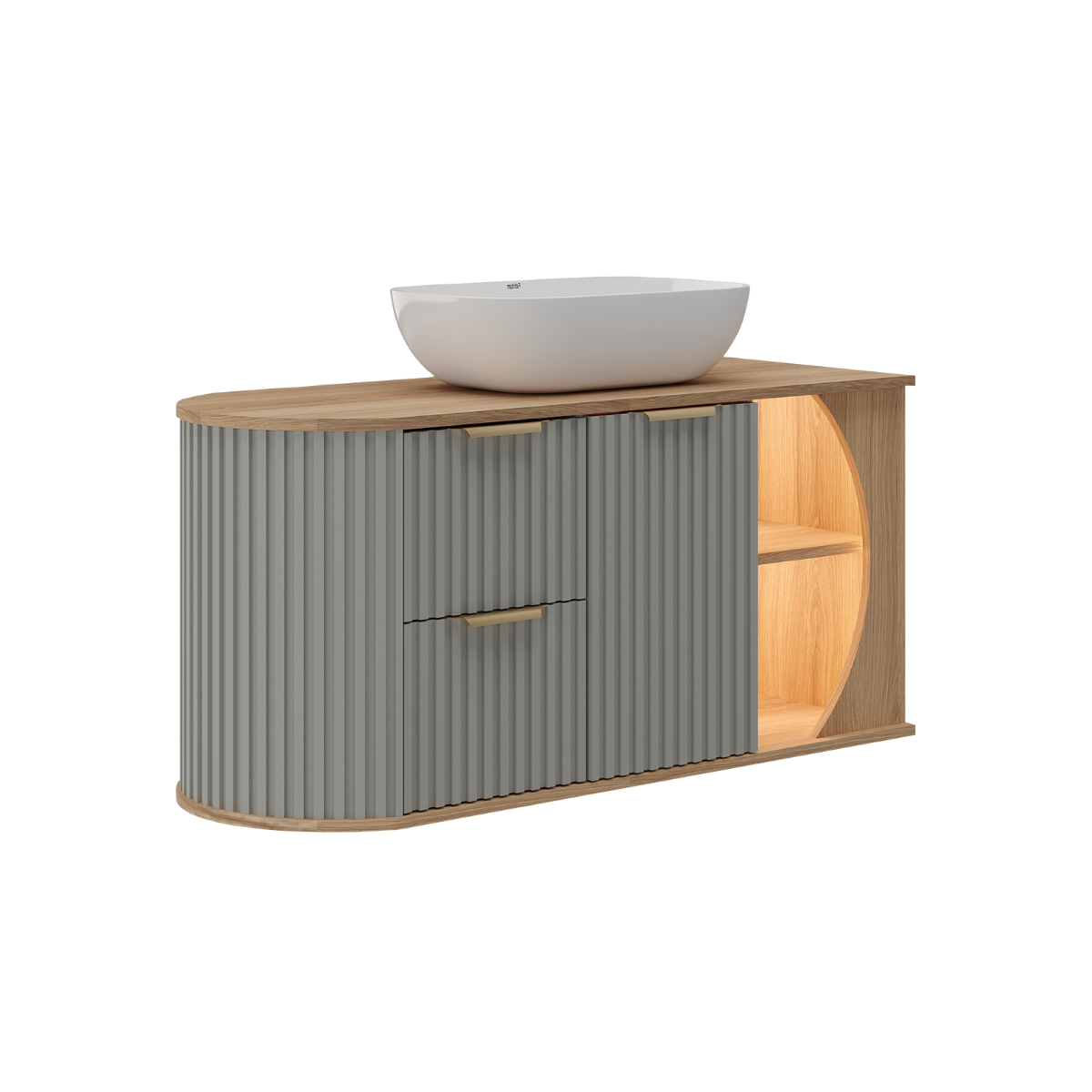 Diseño moderno, detalles refinados y gran funcionalidad para tu baño.Este mueble de baño combina sofisticación y practicidad. Su formato suspendido facilita la limpieza y aporta un estilo liviano al ambiente. Destaca por sus esquinas redondeadas, su elegante nicho lateral con iluminación LED y su frente con diseño de listones recubiertos en PVC, que brindan textura, resistencia y un acabado visual cálido y moderno.Características- Diseño suspendido (aéreo): Optimiza el espacio visual y facilita el mantenimiento.- Frente de listones con recubrimiento de PVC: Estilo único, mayor durabilidad.- Nicho lateral con luz LED: Detalle funcional y decorativo.- Esquinas redondeadas: Seguridad y diseño elegante.- Revestimiento laminado: Resistente a la humedad y a los arañazos.- Tiradores de perfil de aluminio: Prácticos y modernos.- Cajones de apertura total y cierre suave: Comodidad y organización.- Canto de PVC: Mayor protección en los bordes y terminaciones prolijas.MedidasAncho: 100 cmAlto: 49,5 cmProfundidad: 42 cmIncluye Bacha de apoyo Semi OvalColor/Acabado: blanco brillo.Material: loza.Medidas: 45 x 32 x 13,5 cm.El precio no incluye grifería, accesorios ni espejo botiquín. Podés encontrarlos disponibles en nuestras publicaciones. ¡Consultanos para armar tu conjunto completo!