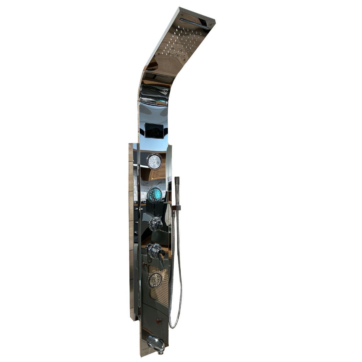 Panel de ducha color cromado Brillante con Display y volante monocomando. Fabricado en acero inoxidable 201.Dimensiones: 150 x 22 cm5 vías de salida: Cascada, lluvia, tres jets de hidromasajes móviles, teléfono y chorro de transferencia inferior. Display con medidor de temperatura , función activa y tiempo de baño. Roseta con luz. Conexión a agua fría caliente por medio de colillas de 1/2 pulgada.Teléfono de mano con sistema anticalcáreo, fabricado en plástico Abs. Largo del flexible 1,40.2 años de garantía.