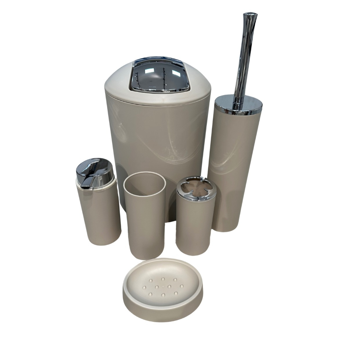 Set de baño 6 piezas: Papelera, dispensador de jabón, jabonera, porta cepillos , porta objetos y escobilla.