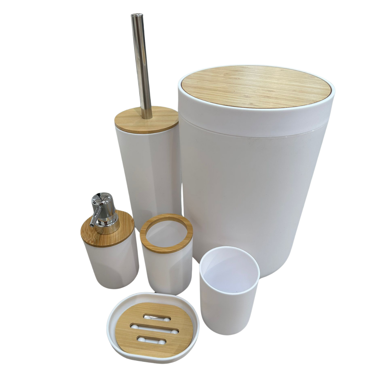 Kit accesorios para baño 6 piezas Plástico blanco y madera.Incluye: Escobilla de baño, papelera, vaso de enjuague bucal, soporte para cepillo de dientes, dispensador jabón, jabonera.