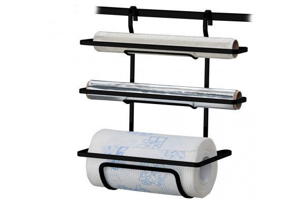 Este soporte sostiene rollos de toallas de papel, aluminio y PVC, manteniéndolos a mano durante la preparación de alimentos. El soporte también deja más espacio libre en la encimera al colgarse de la barra fijada a la pared.