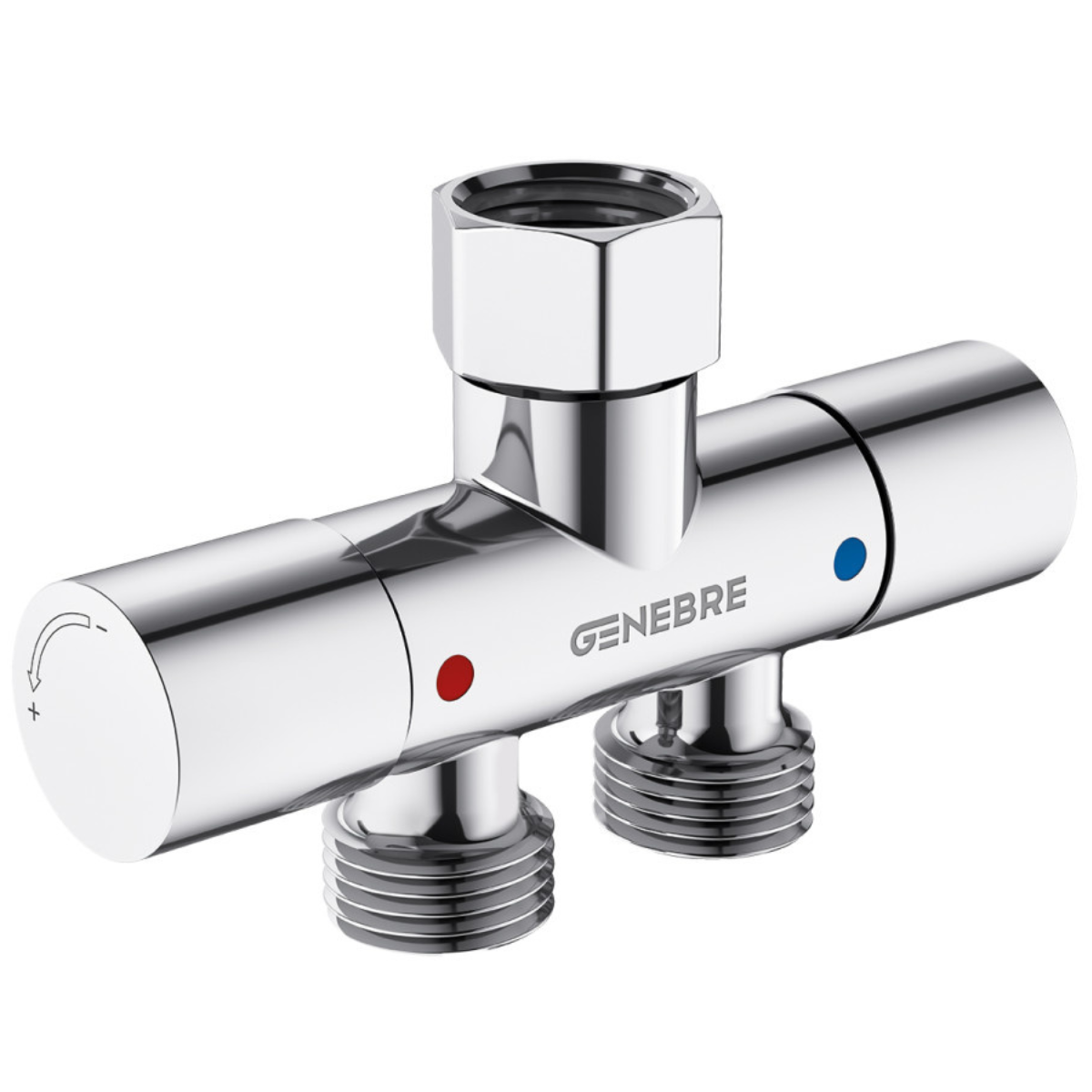 Válvula mezcladora bajo mesada, fabricada en Bronce cromado, utilizada para realizar la mezcla de agua en grifos electrónicos o temporizados de un agua.Permite regular el caudal deseado independientemente para ambas entradas, fría y caliente, de sencilla instalación bajo mesada directamente a rosca de ½”.Una vez instalada la válvula en la rosca de 1/2” del grifo, mediante los volantes se puede regular el caudal de agua fría y caliente que entra al grifo, y de esta manera conseguir la temperatura que se desea.Temperatura máxima: 70 °C.Temp. máxima recomendada: 50 °C.Presión máxima: 7 bar.Presión mínima: 0,5 bar.Presión recomendada: 1-3 bar